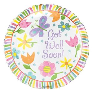 13. 22cm (9”) Rnd Get Well Soon Flowers & Stripes - White/Multi