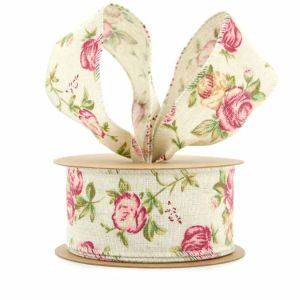 Linen Printed Flower Ribbon Wire Edge 50mmx10m - Hot Pink/Cream