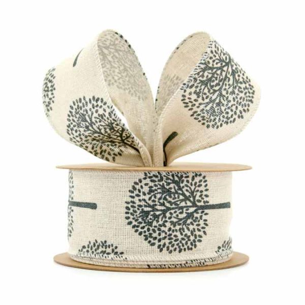 Linen Printed Tree Ribbon Wire Edge 50mmx10m - Navy Blue/Cream