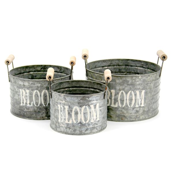 Tin Round “Blooming Right” Bucket w/Handles Set/3 19Diax11Hcm - Grey
