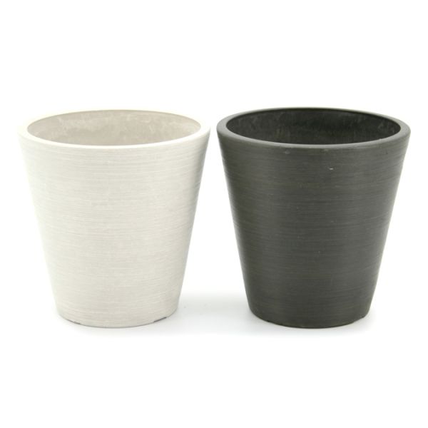 These gorgeous pots are made from a composition of 40% natural products (30% stone and 10% wood) and 60% recycled polypropylene plus UV resistant agent. They are very sturdy and much lighter than ceramics.